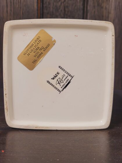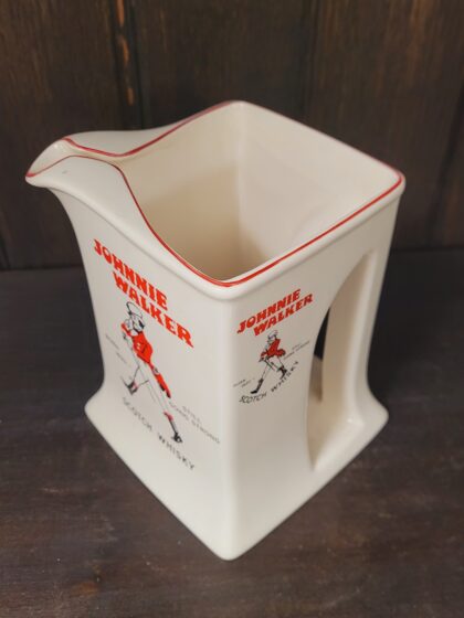 A white glazed ceramic bartop water jug. Bears red and black lettering which reads, "Johnnie Walker Born 1820 - Still Going Strong Scotch Whisky". Made by Wade and bears black backstamp to base. Features integrated handle.