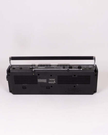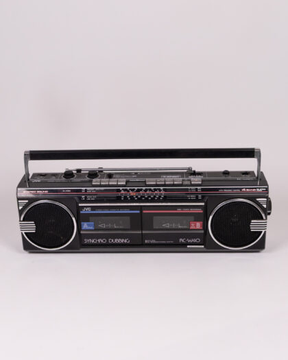 Vintage JVC RC-W40 stereo system. This is a black, 4 band super heterodyne stereo system from JVC with Synchro Dubbing. It features two cassette players as well as radio. There is some light surface wear and marks consistent with age. Untested. This is a vintage piece and may require some servicing or repair.