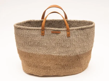 This striking two-tone KAZA shopper bag is handwoven in Kenya’s rural Eastern Region, and hand dyed using 100% natural dyes. Perfect as an everyday handbag with room to pack for overnight stays, grocery shopping and trips to the gym.