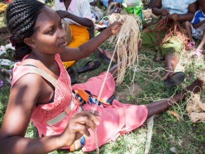 Crafted from local sisal grass, the preparation process is extensive even before dyeing and weaving begins: the grass is first harvested and rolled by hand. The bag's bottom half is dyed with charcoal crushed in boiling water and heated over an outdoor fire, whilst its darker top section is dyed with chimney soot gathered from weavers’ home chimneys. The bag features sturdy leather handles.