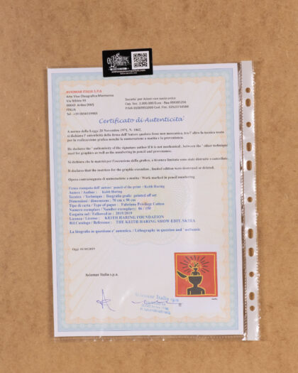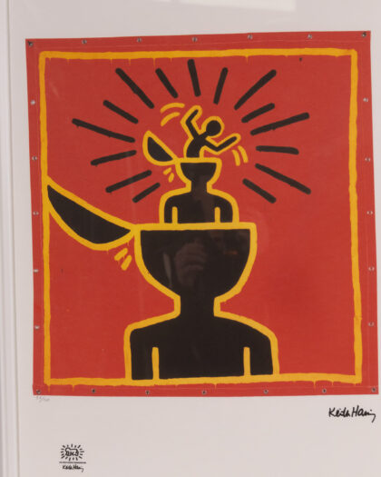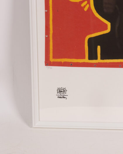 This Keith Haring lithograph is a striking piece of pop art, professionally framed. The lithograph features a bold design with vibrant red, black, and yellow colours. The artwork is printed on Fabriano Privilege Cotton paper and comes with a certificate of authenticity. Displaying an abstract figure, the lithograph captures Haring's signature style. The lithograph is framed in a simple white wooden frame with glass front. There may be slight wear on the frame, but the lithograph is in good condition. Perfect for adding a touch of modern art to any room.