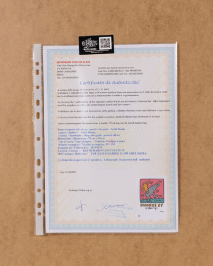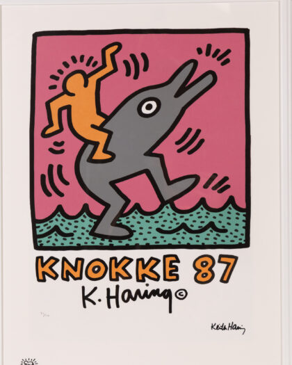 This is a framed print of Keith Haring's 'Knokke 87'. This print features an image of a figure riding a dolphin. The print is signed and numbered 33/150. The artwork is framed in a white wooden frame and glazed. A certificate of authenticity is present on the reverse of the frame. The condition is very good with only minor signs of age and wear.