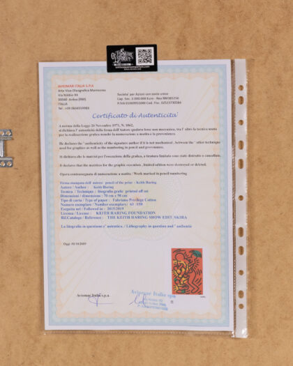 A framed lithograph by Keith Haring, a limited edition piece numbered 63/150. The artwork features Haring's iconic figures in black outline with blocks of red, yellow, and green on a white paper. It is housed in a simple black wooden frame. The piece is accompanied by a certificate of authenticity from Aviomar Italia S.P.A. The artist's signature is printed on the lithograph. A vibrant and engaging artwork, this is a perfect addition to any modern home decor.