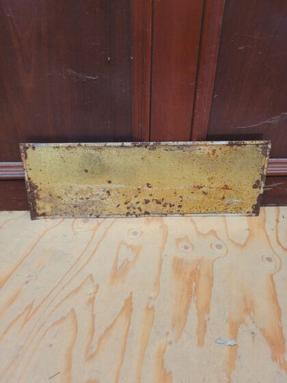 A painted tin advertising sign. Bears black lettering which reads, "Kensitas Fine Cigarettes are here!".
