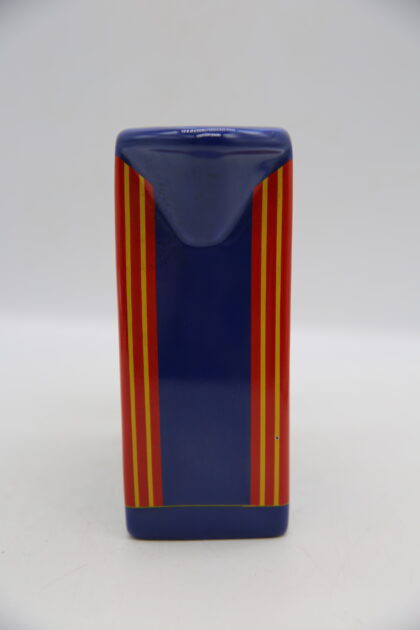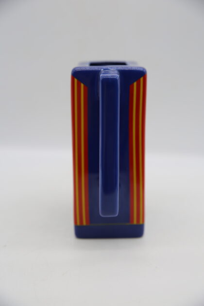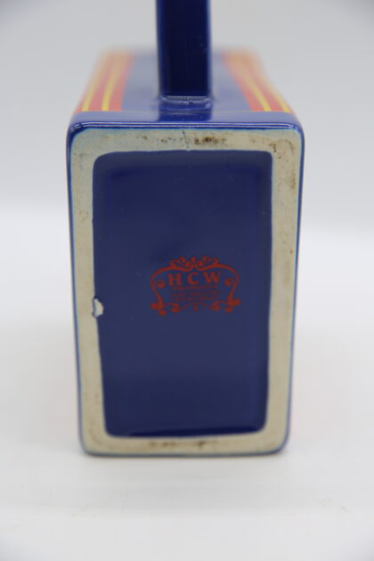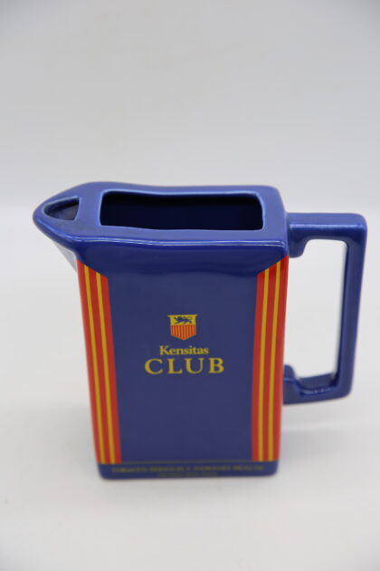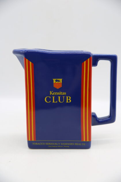 A blue ceramic glazed bartop water jug of rectangular form. Bears yellow lettering which reads, "Kensitas Club Tobacco Seriously Damages Health Chief Medical Officer's Warning". Made by HCW Prompots and bears red backstamp to base.