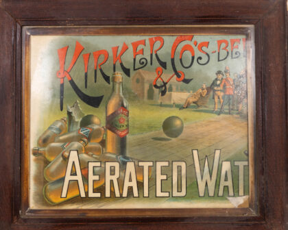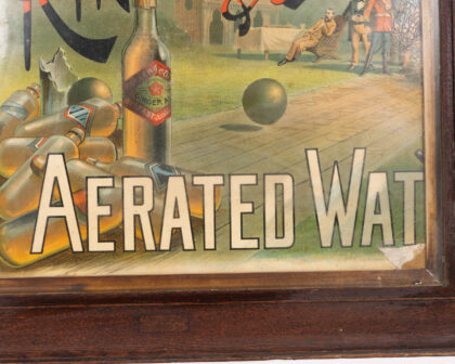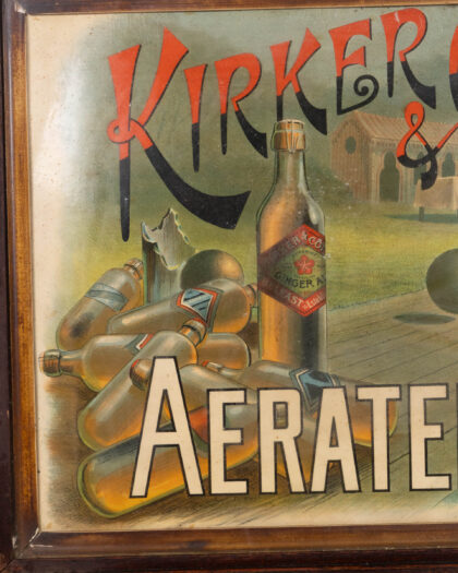 Vintage Kirker & Co Aerated Water advertising print in a wooden frame, depicting ginger ale bottles and a bowls scene. Good for home bar decor.