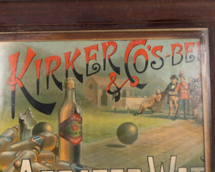 This is a vintage framed advertising print for Kirker & Co Belfast Aerated Water. The sign features an image of Kirker's Ginger Ale bottles with a pastoral background depicting people playing bowls. The frame is wooden and shows signs of age. The advertising is a colourful lithograph mounted on card. There are areas of damage to the lithograph and chips to the frame commensurate with age. The print has been cropped on the right hand side. A unique piece of breweriana advertising, ideal for a home bar or drinks collection.