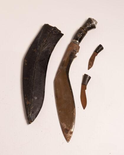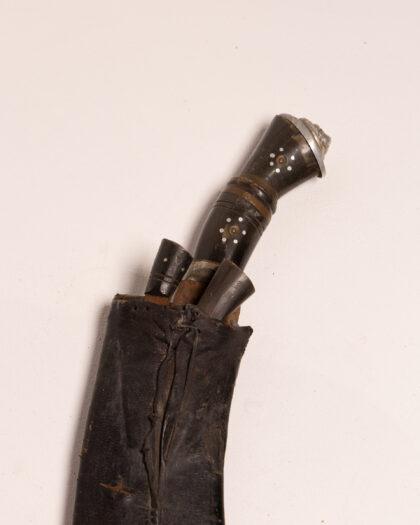 Vintage Kukri knife set with leather sheath. Unique collectible with signs of age. Ideal for collectors or historical enthusiasts.
