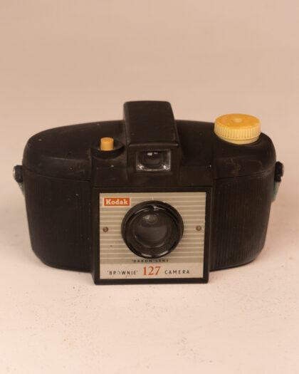 This Kodak Brownie 127 camera is a vintage collectible item featuring the iconic 'Dakon' lens. It showcases classic design elements and offers a glimpse into historical photography equipment. This item has not been tested, we cannot verify if it is working or not and is sold as a prop only. The camera is in fair condition with visible signs of wear, making it a perfect addition to any vintage camera collection or display.