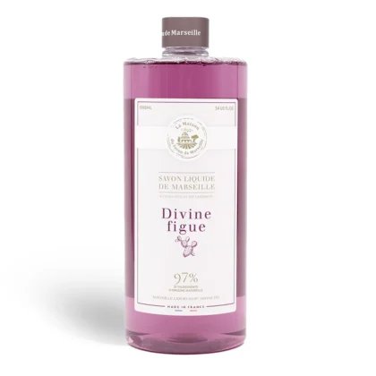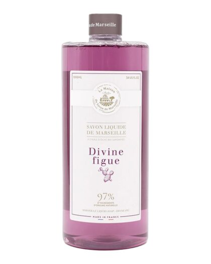 La Maison Divine Figue liquid soap, presented in a 1000ml plastic bottle. The soap is made with olive oil and boasts 97% natural ingredients. The bottle features a label with the brand's logo and details about the product, including the fragrance 'Divine figue'. The overall design is clean and simple. The product is in excellent condition. A practical addition to any bathroom or kitchen.