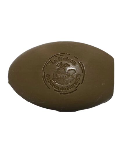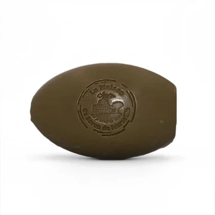 Olive oil soap bar by La Maison du Savon de Marseille, France. Classic egg-shaped bar, stamped with company branding.