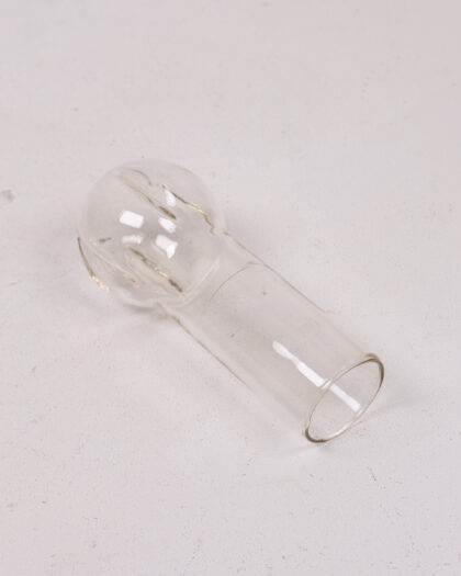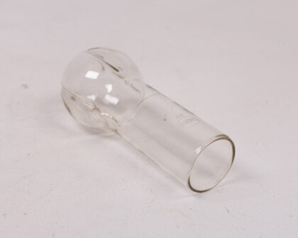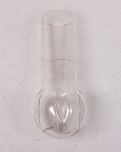 This is a clear glass laboratory flask, likely used in chemistry or biology settings. The flask has a distinctive shape, with a bulbous bottom and a cylindrical neck. There is a faint maker's mark etched near the top of the cylinder. Given its design, this flask may have been used for distillation or other lab processes. This flask is in good condition and would make a cool piece of decor for your house.