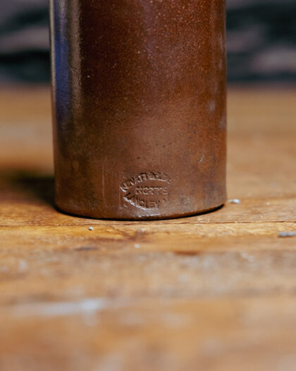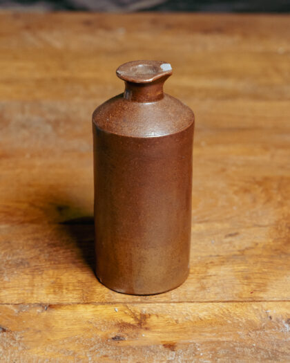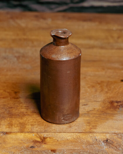 A brown stoneware ink bottle made in Langley Mill Nottingham.