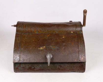 This is a vintage lacquered metal toolbox with a hinged lid and clasp. The metal has a worn, rusted appearance, with traces of blue paint underneath, giving it a rustic and industrial aesthetic. It has been professionally lacquered by the On The Square Workshop in order to preserve the vintage look but prevent any further rust damage. It features a handle on one side for carrying. The interior shows signs of age and use, adding to its vintage charm. Overall, it is in fair condition, consistent with its age and history. This box would make a unique storage solution or decorative item.