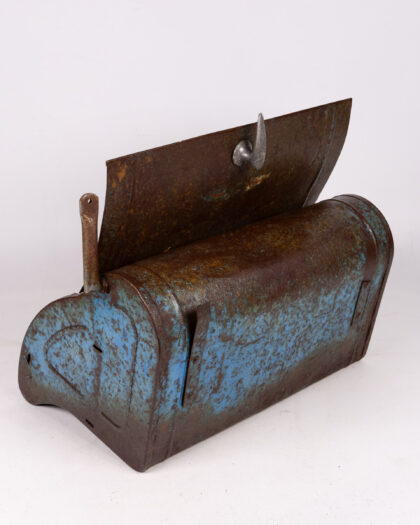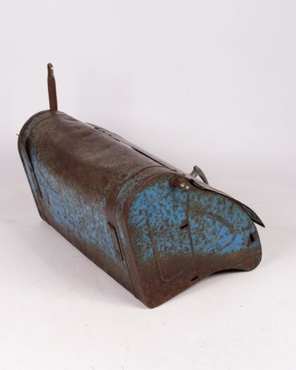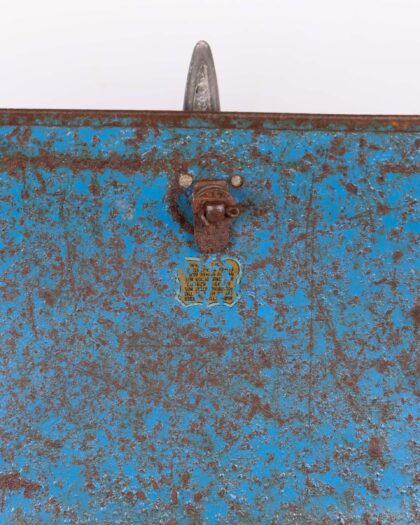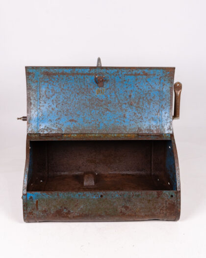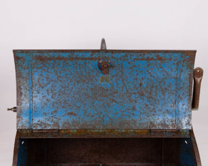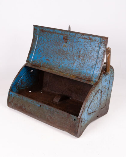 Vintage metal box with hinged lid. Blue paint showing underneath rusted brown, has been professionally lacquered by the On The Square workshop in order to preserve the vintage look but prevent any further rust damage. Rustic, industrial storage with vintage charm. Good condition.