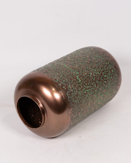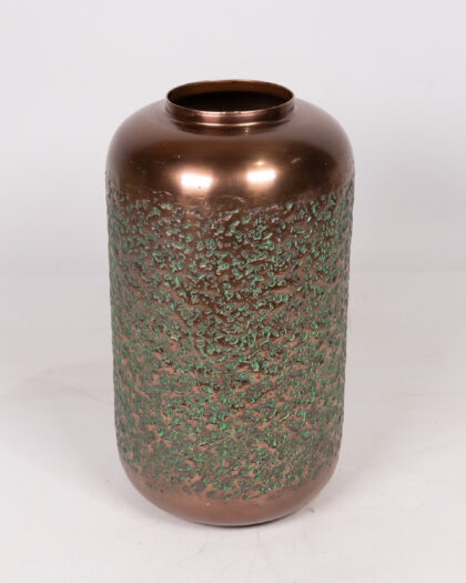 This striking copper-effect aluminium vase features a textured, hammered design that adds a touch of rustic elegance to any space. The vase has a cylindrical shape with a smooth, polished neck and base, contrasting beautifully with the rough texture of the body. The copper-effect coating has a warm, reddish-brown hue with hints of green in the textured areas, giving it a unique, aged appearance. It's perfect for displaying floral arrangements or as a standalone decorative piece. Its unique texture and warm colour make it a standout piece for any home decor.