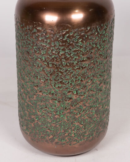 Unique textured copper-effect vase. Cylindrical shape with hammered design. Perfect for flowers or as a decorative accent. Adds rustic elegance.