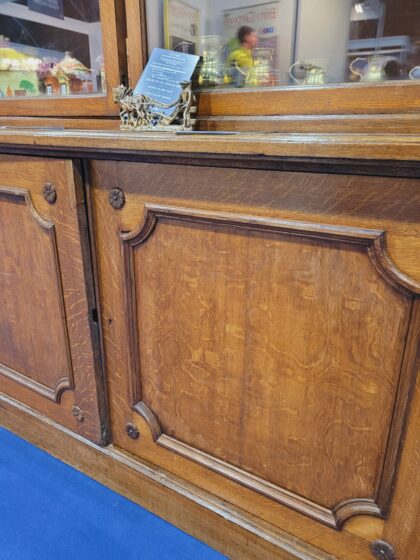 A Large Antique Oak four-section Bookcase , it is 310 cm wide , 49cm deep and 260cm tall. This Large Antique Oak four-section Bookcase has 4 large glazed doors on the top tier with adjustable shelves to displays you most prized book collection or display your highly valued antiques and collectibles. The lower tier has 4 oak doors with adjustable shelves for added storage.