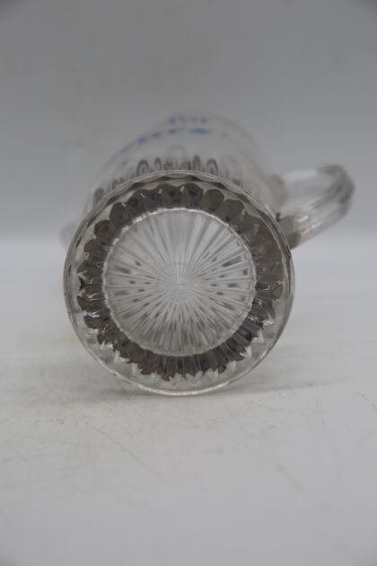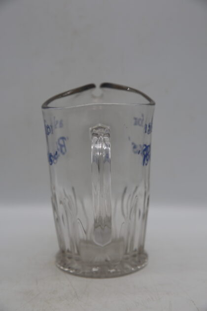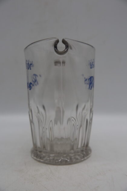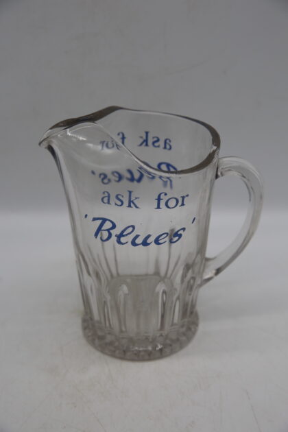 A glass bartop water jug. Bears blue lettering which reads, "ask for 'Blues'".