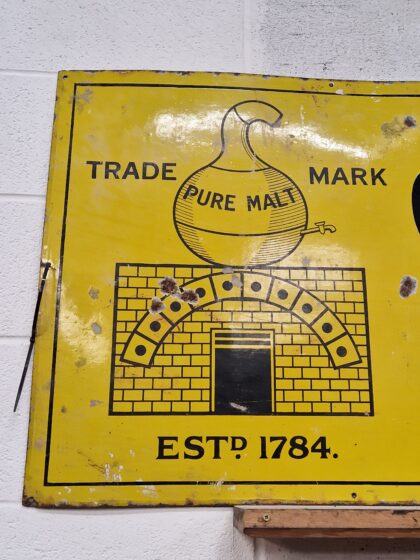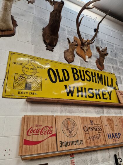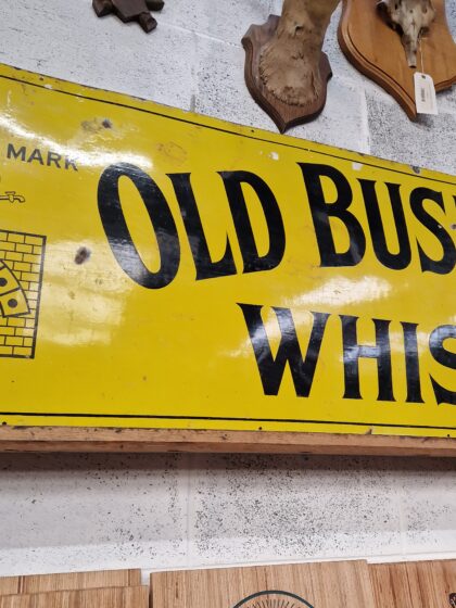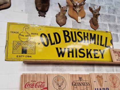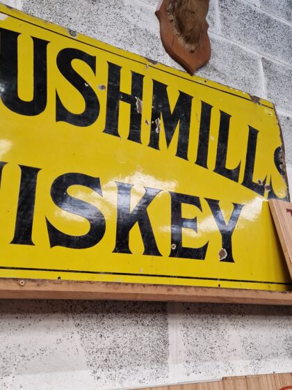 A large yellow enamel advertising sign for Old Bushmills Whiskey. The right hand side of this sign has been removed.
