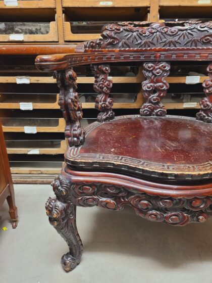 Large contemporary, heavily carved, oriental armchair. Repair to back leg.