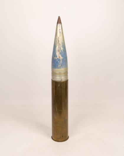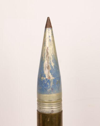 This large artillery shell, featuring a brass casing and a blue-tipped projectile, is an eye-catching piece for any military enthusiast or collector. The shell displays signs of wear and patina, adding to its rustic charm. Ideal for display in a study or living room, this piece measures approximately XX inches in height. Its historical appeal and unique design make it a standout addition to any collection.