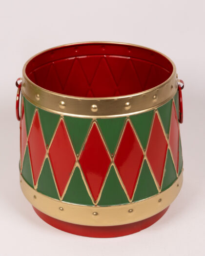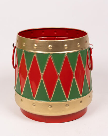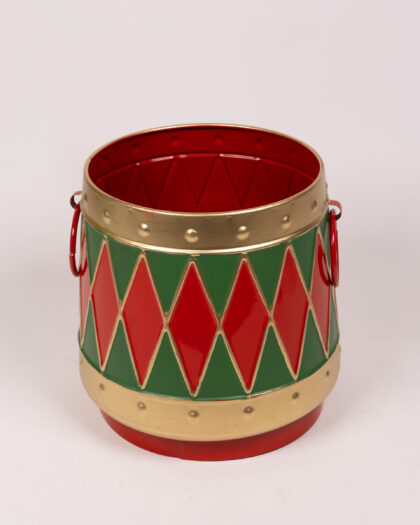 Add a festive touch to your decor with this charming Christmas drum pot. The pot is made from sturdy metal, painted in bright red, green, and gold colours. The drum design features alternating red and green diamond shapes with gold trim. Perfect for displaying small plants, festive decorations, or sweets. This eye-catching pot will bring a touch of Christmas cheer to any room.