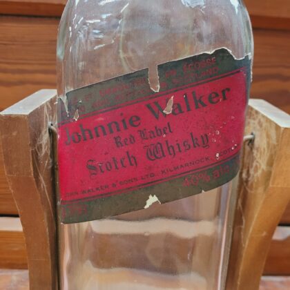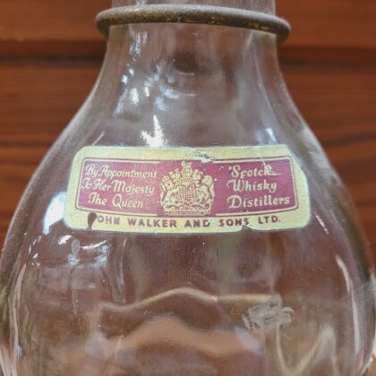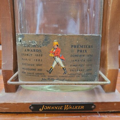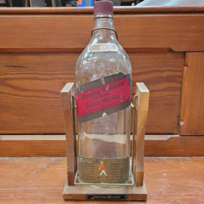 A large glass Johnnie Walker whisky bottle in a rocking cradle.