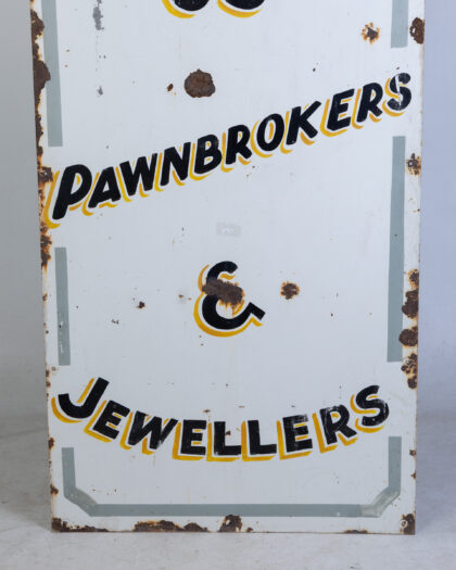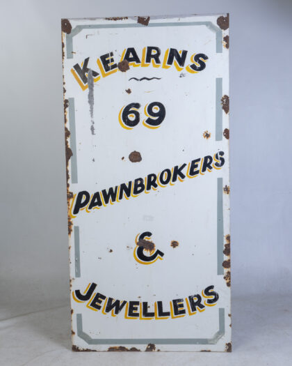 Original vintage 'KEARNS Pawnbrokers & Jewellers' enamel advertising sign. A quirky piece of vintage decor!