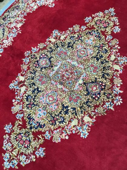 Good condition old Kerman carpet with no visible signs of damage, still displaying strong bright original colours.