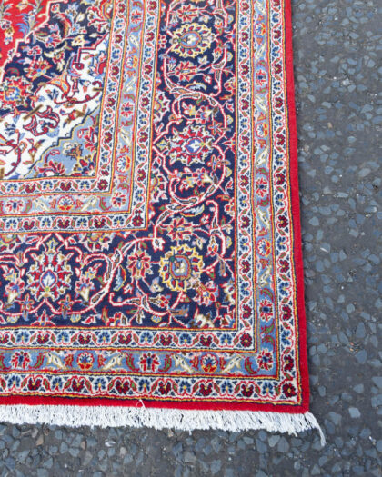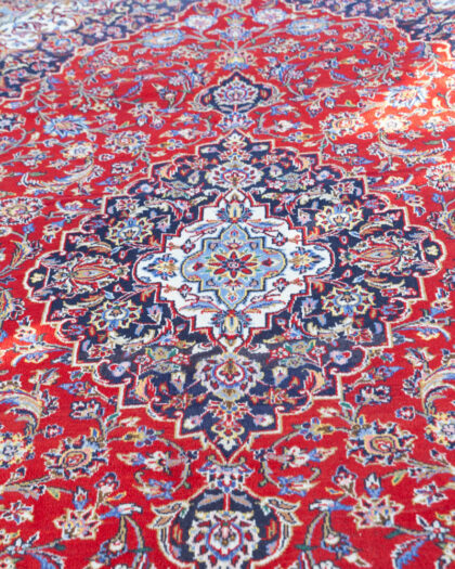 This is a large hand-knotted Persian wool rug featuring an intricate floral medallion design. The primary colour is a rich red, with secondary colours including blue and cream that highlight the detailed floral patterns. The rug showcases a central medallion surrounded by layers of floral motifs and geometric borders, typical of traditional Persian rug design. The hand-knotted construction and natural wool fibres contribute to the rug's luxurious feel and durability. The rug is in excellent condition, with vibrant colours and intact fringes. Its large size and detailed design make it a statement piece that could be used in a living room or dining room.