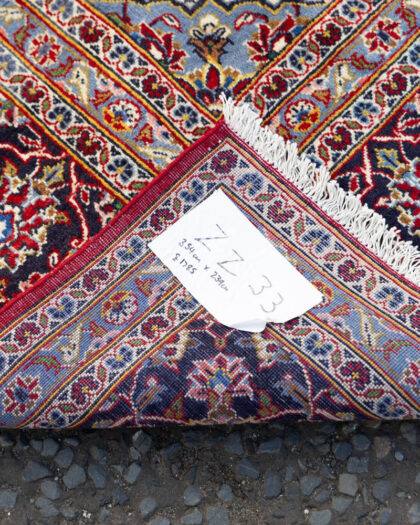 Large hand-knotted Persian wool rug. Features a detailed floral medallion design in red, blue and cream. Excellent condition. Size: 3.50cm x 2.39cm