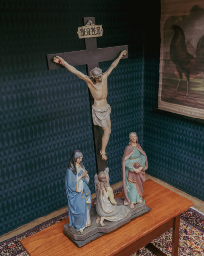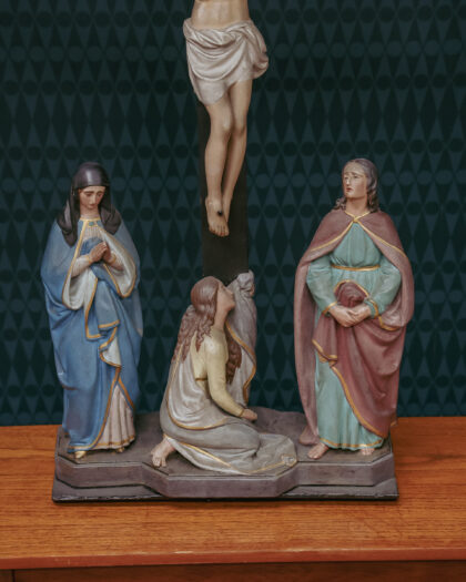 A Victorian statue of a crucifixion scene. This has been restored, repaired and repainted by a local expert and brought back to it's original glory.