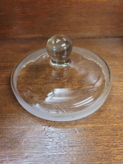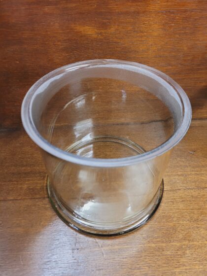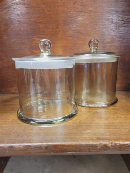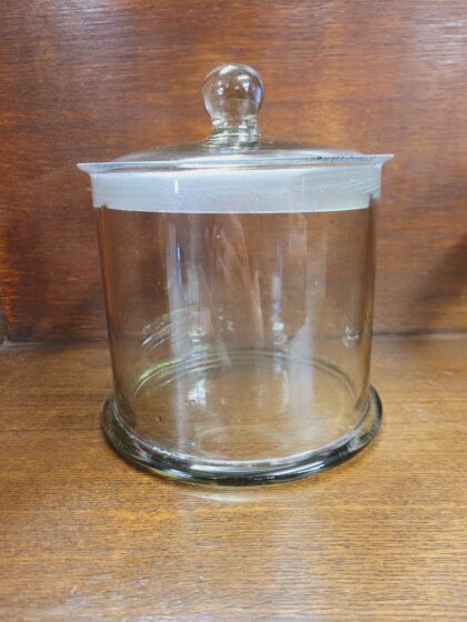 A large vintage glass apothecary jar with lid. Jars in photos are samples and there may be slight variations in size and colour between jars.
