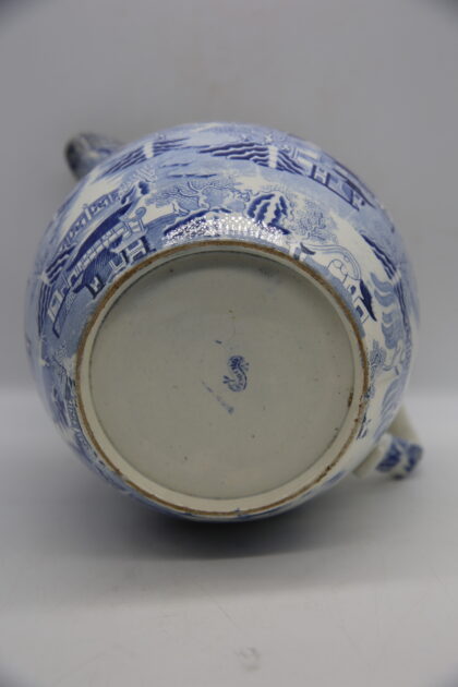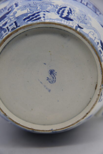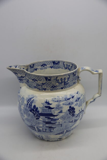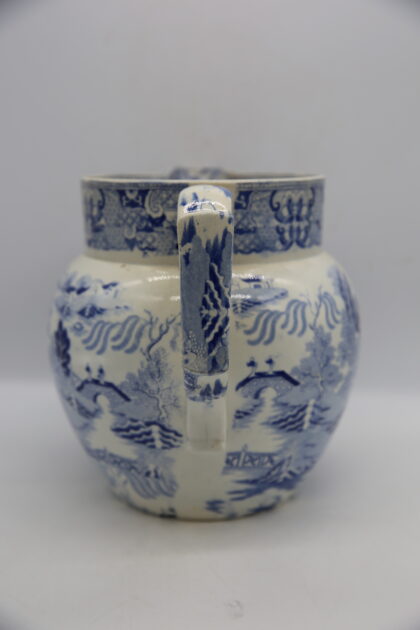 A late 19th / early 20th century blue and white pottery 'Willow' pattern jug with shaped 'C' scroll handle. Makers mark is indistinct.