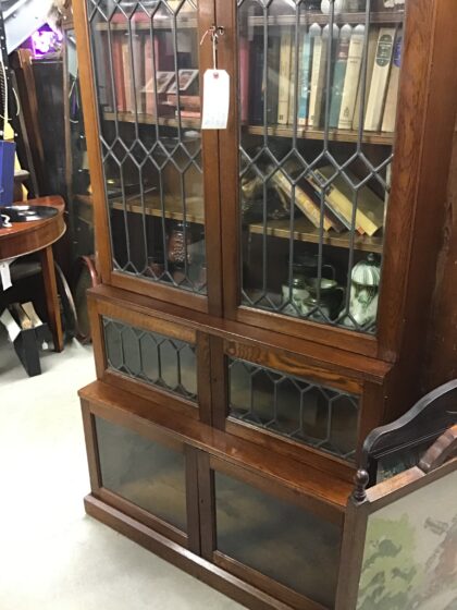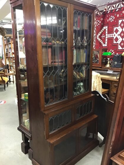 Beautiful leaded bookcase/glass-fronted cabinet. Three lockable sections. Four sturdy wooden shelves in top section, each of which can be very handily height-adjusted. 197cm tall. 91cm wide, 25cm deep at top, 38cm deep at base.