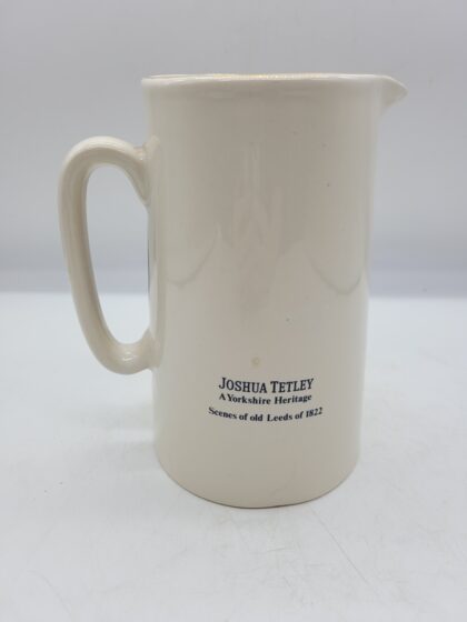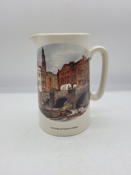 White glazed ceramic jug. Applied picture and text, "Leeds Bridge".