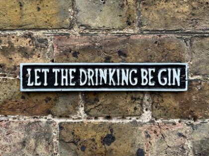 This witty cast iron sign bears the declaration "Let The Drinking Be Gin". With white raised handpainted lettering on a black background, this plaque is aimed squarely at the gin lovers amongst us! With two predrilled holes for easy mounting, this bar-ready plaque adds a spirited touch to your home bar, kitchen, or entertaining space!