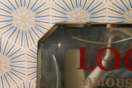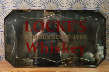 Vintage advertising mirror for Locke's Whiskey in clip frame.
