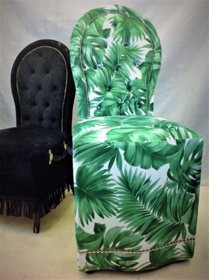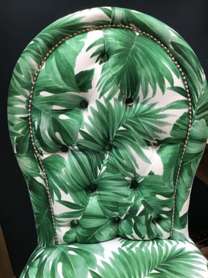 Introducing a bold and stylish piece that’s sure to become a conversation starter in any room. This reupholstered lounge bar chair boasts a high-back design covered in lush green leaf print fabric, exuding both charm and vibrancy. Its quirky aesthetic makes it an excellent choice for colourful homes, eclectic bathrooms, or creative spaces.