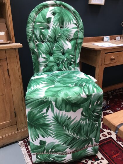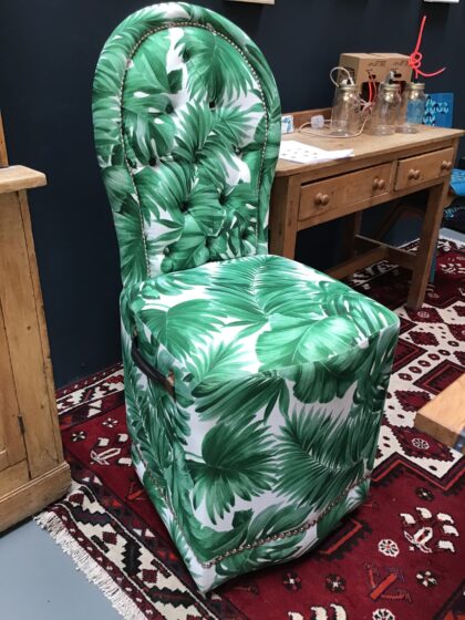 Add a touch of botanical elegance to your space with this reupholstered lounge bar chair. Featuring a vibrant green leaf print fabric, this high-back chair is perfect for quirky, colourful homes or unique interiors. Previously priced at £350, it’s now available for just £150. First come, first served!
