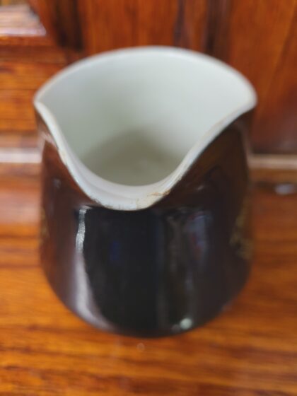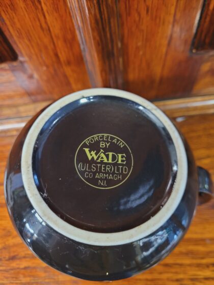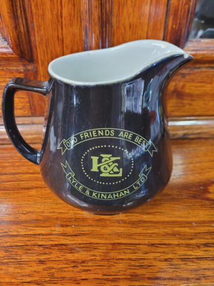 A black glazed ceramic bartop water jug. Bears yellow lettering which reads, “Old Friends are Best Lyle & Kinahan Ltd”. Made by Wade and bears yellow backstamp to base. Has a few small chips to spout.