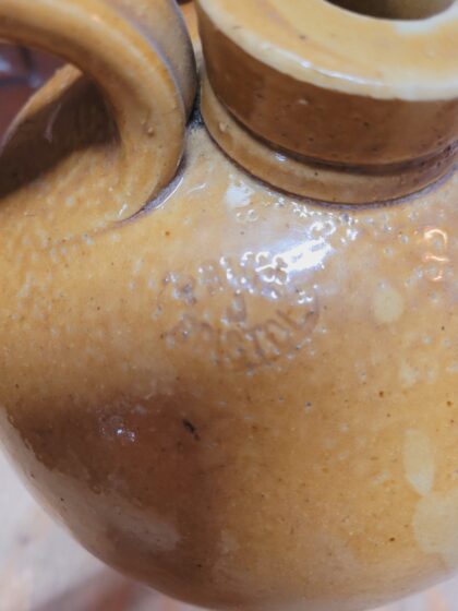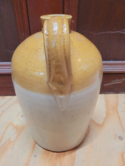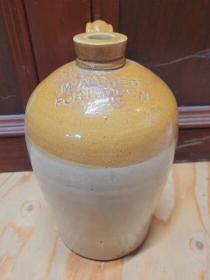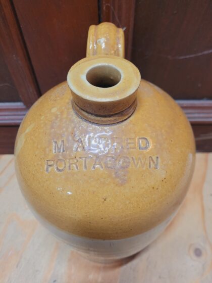 A brown two tone glazed stoneware flagon. Bears impressed lettering which reads, "M. Aldred Portadown". Made by Price Bristol and bears impressed maker's mark.