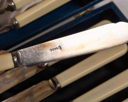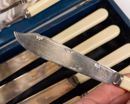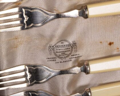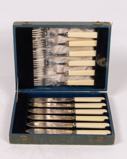 This is a vintage silver plated cutlery set. It comes with fish knives and forks, all neatly arranged inside a presentation box. The set includes six forks and six fish knives. The handles are a cream/ivory colour. The box is marked with M M Henderson, a jewellers, silversmiths and opticians. There is wear and tarnishing to the silver plate and the box shows signs of age.