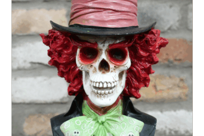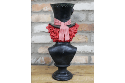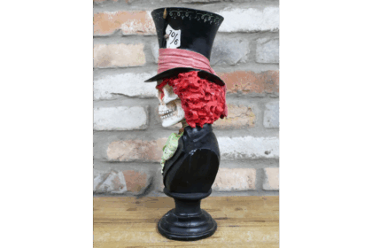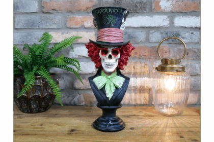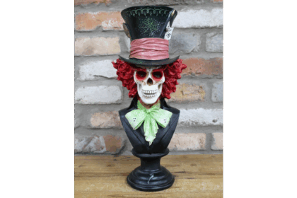 Striking Mad Hatter skull bust ornament. A unique piece for fans of Alice in Wonderland, Halloween enthusiasts, or collectors of quirky decor.