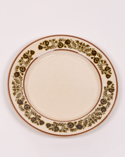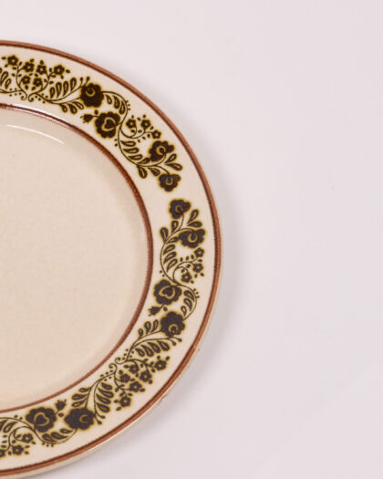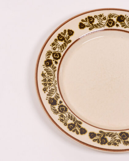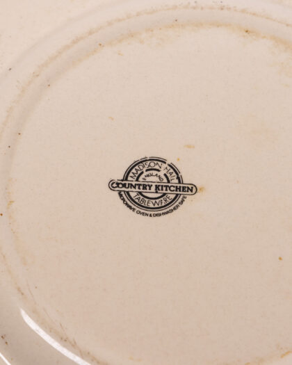 Discover this charming set of six vintage 'Country Kitchen' ceramic plates by Madison Hall, England. Each plate features a warm cream base adorned with a distinctive dark brown floral border and a subtle brown line accenting the inner rim. Perfect for adding a touch of rustic vintage charm to your dining setting, these durable plates are designed for modern convenience. They are fully microwave, oven, and dishwasher safe, making them ideal for everyday use or special occasions. This set is in good vintage condition, showing only minor wear consistent with its age, preserving its authentic character.