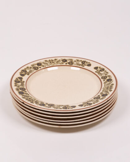 Vintage set of 6 Madison Hall 'Country Kitchen' ceramic plates from England. Features a cream base with a brown floral pattern. Microwave, oven, and dishwasher safe.