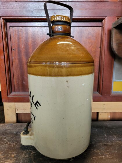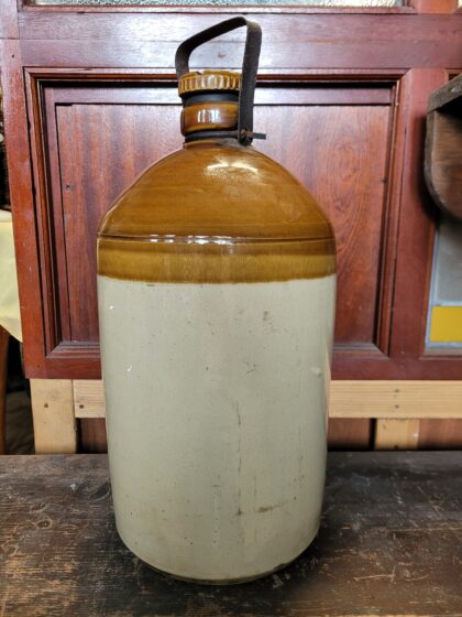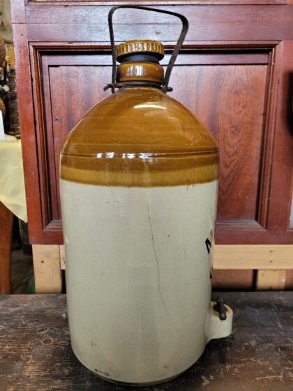A brown two tone glazed stoneware flagon with metal handle, tap and screw fitting lid. Bears black lettering which reads, "Magdale Vinery Limited Quality Wines".