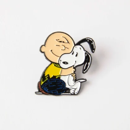Charming Magpie + Peanuts enamel pin featuring Charlie Brown hugging Snoopy, perfect for fans.