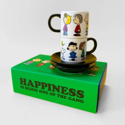Charming Magpie + Peanuts Espresso Set featuring two porcelain cups with beloved Peanuts characters, black handles, and matching saucers. Presented in a vibrant gift box, it's a perfect gift for fans and coffee lovers.